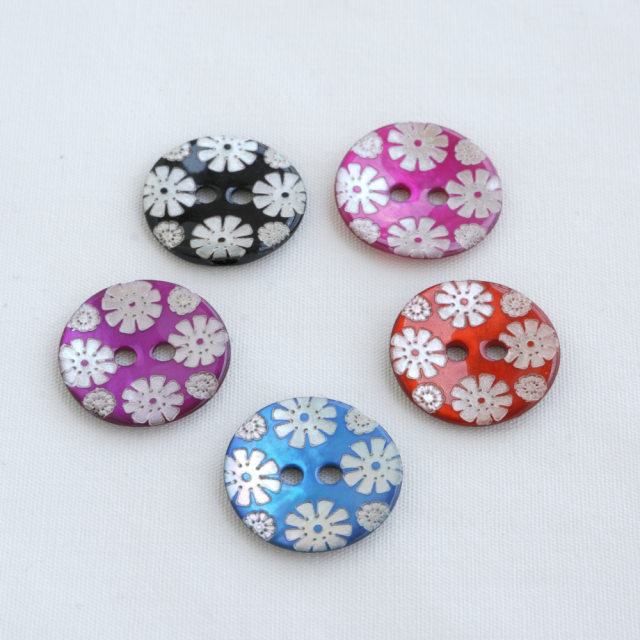 きれいな色に染められた貝ボタンの表面に花柄模様が彫ってあります。