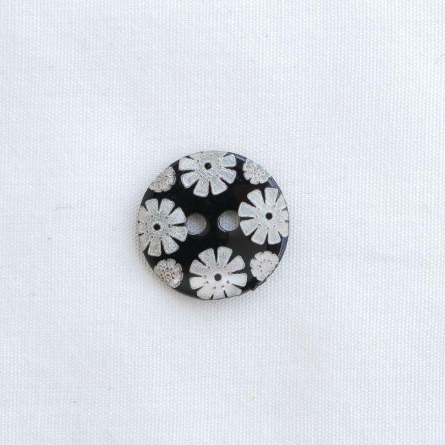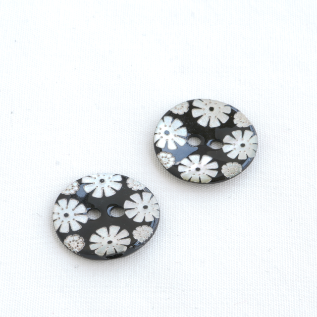 きれいな色に染められた貝ボタンの表面に花柄模様が彫ってあります。