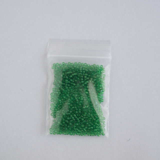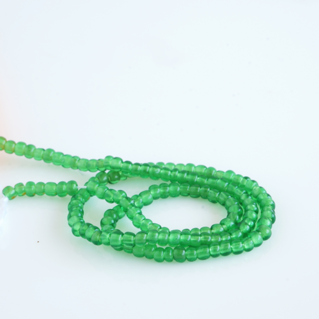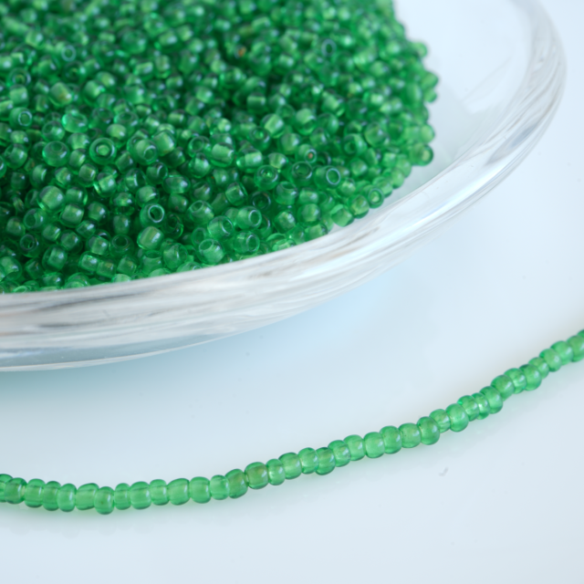 ベネチアンシードビーズの『エメラルドグリーン』に似ていますがもう少し小さく外径約2mmで色も少し明るいです。