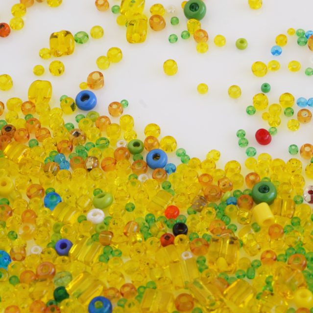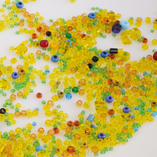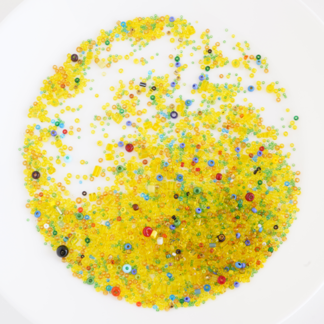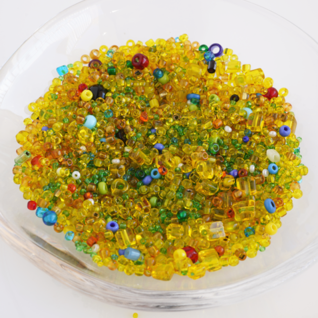 一番多く入っている黄色の透明のビーズが外径約2.3mm、とても小さいグリーンのビーズは約1mmほどです。
