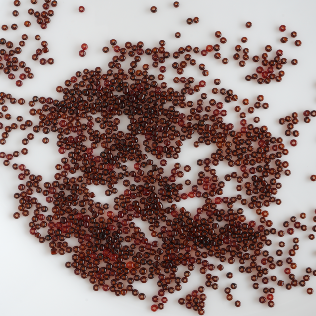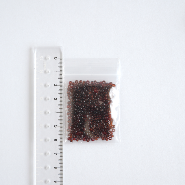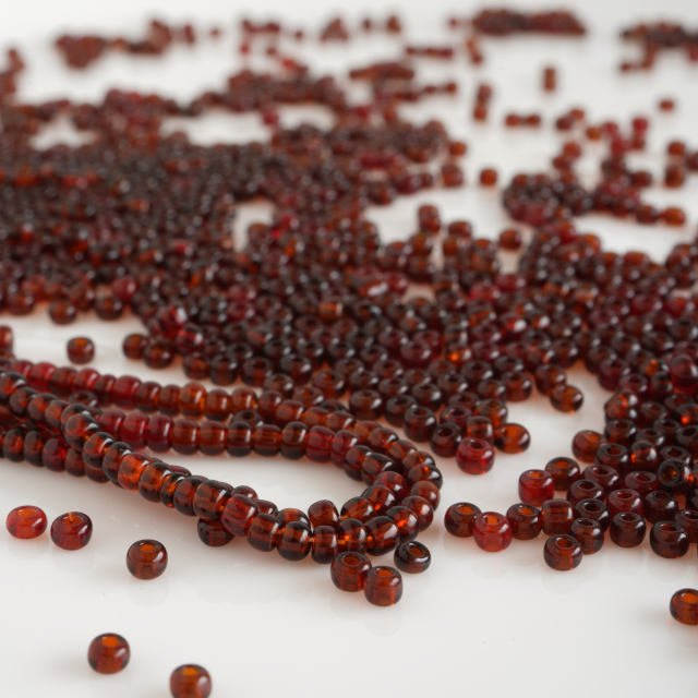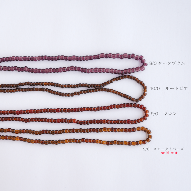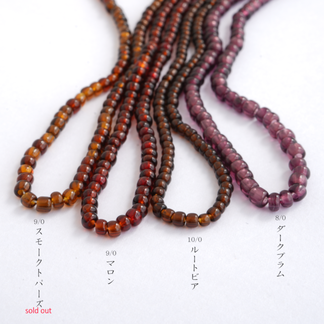透明の赤みを帯びたマロンカラーですが、赤寄りの色のビーズも時折混ざっています。