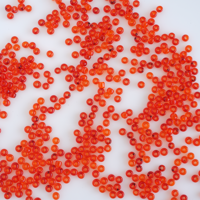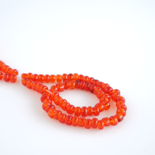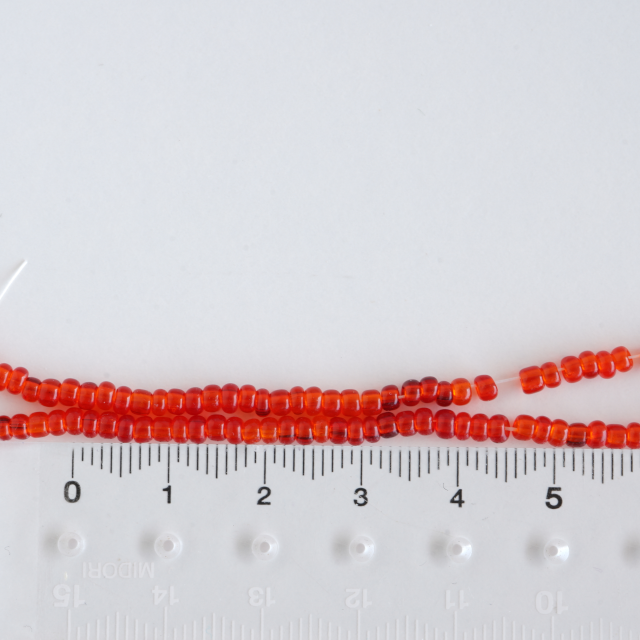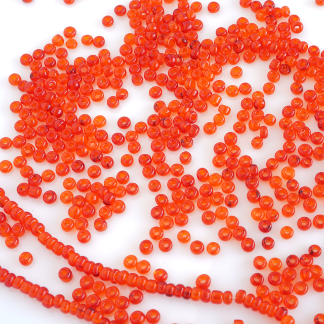 朱色のような赤がメインですがところどころ濃い赤色のビーズも混ざっています。