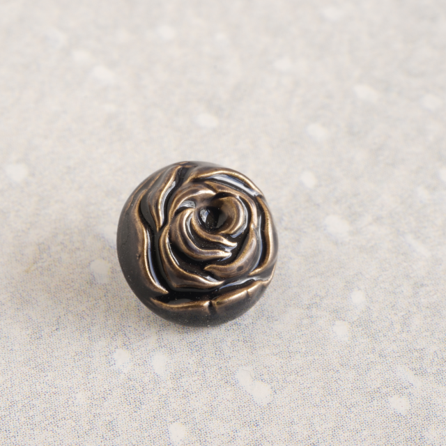 プラスチック製なのですが、ほぼ黒色のつやつやしたエナメル風質感の花びらの先がまるでブロンズかなにか金属のようにも見えます。